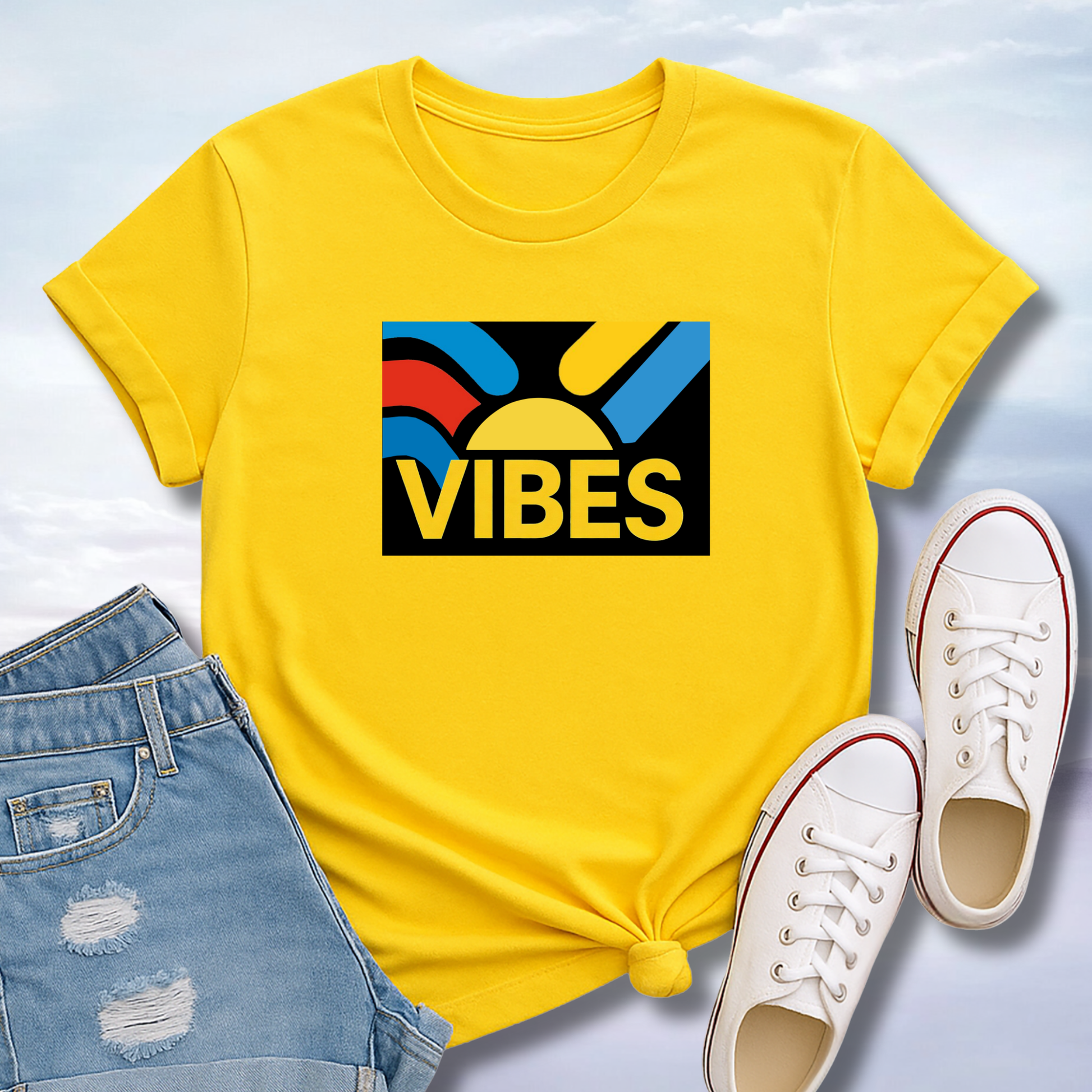✨Wear it: A radiant sun bursts through colorful waves in red, blue, and yellow strokes against a bold black frame, "VIBES" declaring its truth in unapologetic script.